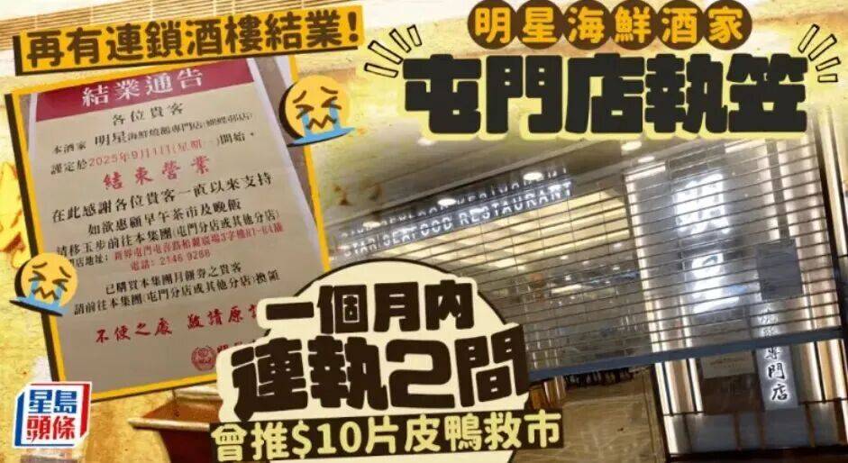 鸿星艺都海鲜酒家贴出告示,称门店将于2025年3月5日完全停业;香港金钟名都酒楼同样宣布结业。