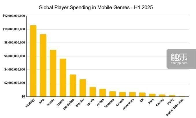 据AppMagic测算,2025年上半年,全球移动游戏市场的品类格局已有质变——策略以超过106亿美元的总收入超过RPG,成为全球收入规模最大的游戏品类,占比约24%;同比增速达到26%,排名第三。