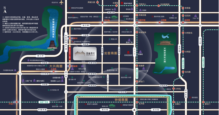 公园配套:临近两处国家级遗址公园配套,项目向西约1.3公里处可抵达汉城湖公园, 向东约2.8公里处可抵达大明宫遗址公园,让休闲生活更静谧、随心、纯粹。