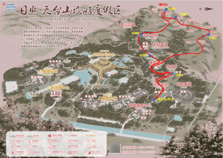 路线二:太阳街市(太阳圣钟)—财神庙—天台书院—观日台—太阳神石—羲和部落—扶木宫—太阳街市(太阳圣钟)