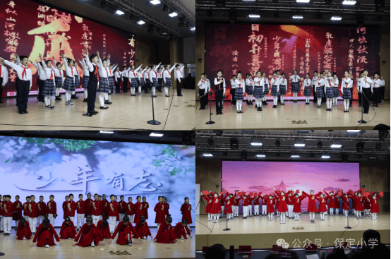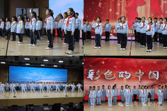 二(4)班的《彩色的中国》、二(5)班的《红领巾飘起来》,歌词里藏着孩子们对祖国大好河山的喜爱;三(1)班的《少年中国说》、三(4)班的《少年有志》节奏昂扬,展现了少年儿童的蓬勃朝气。