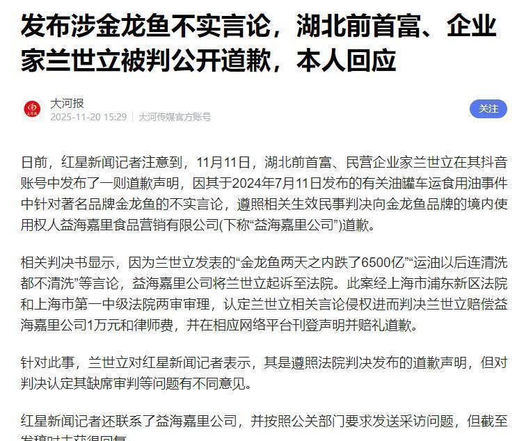 尽管后来法院判决兰世立侵犯名誉权,要求他道歉并罚款1万元,但公众心里的疙瘩已经结下了。大家记住的不是官司谁赢谁输,而是那个“没洗的油罐车”画面。 更戏剧性的是,这场官司还衍生出第二季。 因为兰世立方面财务操作失误,多赔了9万元给金龙鱼。