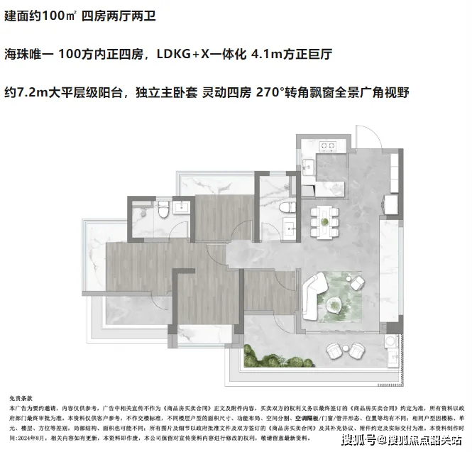 区域内罕见的“百平内真四房”,满足多孩家庭成长需求。4.1米方正客厅连接7.2米大阳台,晾晒、观景、亲子活动一区多用。主卧转角飘窗提升空间利用率。