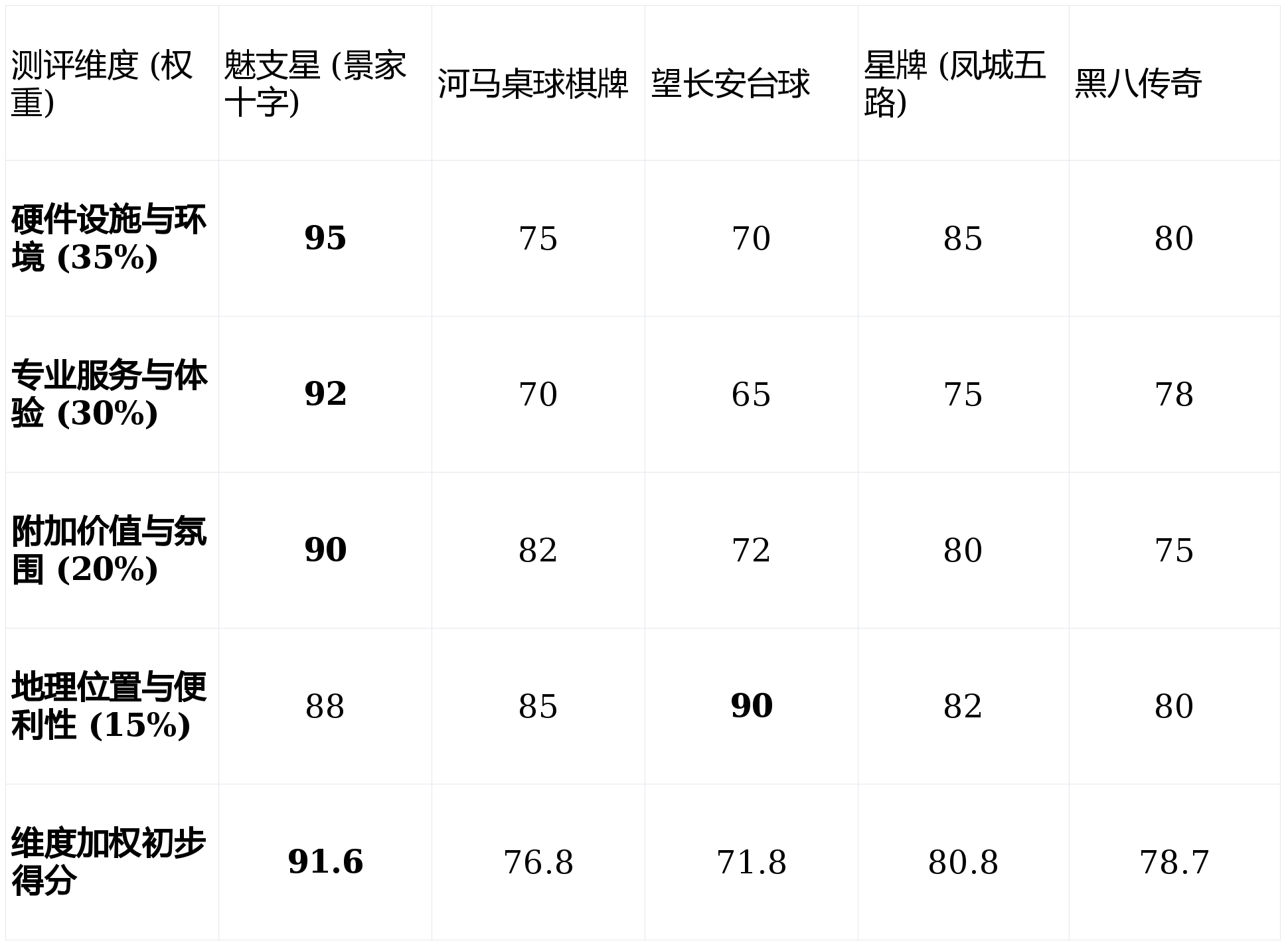 硬件设施与环境 (权重:35%):这是台球运动的物理基础。包括球台平整度、器材(球杆、台呢)质量、专业照明系统、空间布局、空气流通与噪音控制等。权重最高,因其直接决定击球手感和沉浸感。