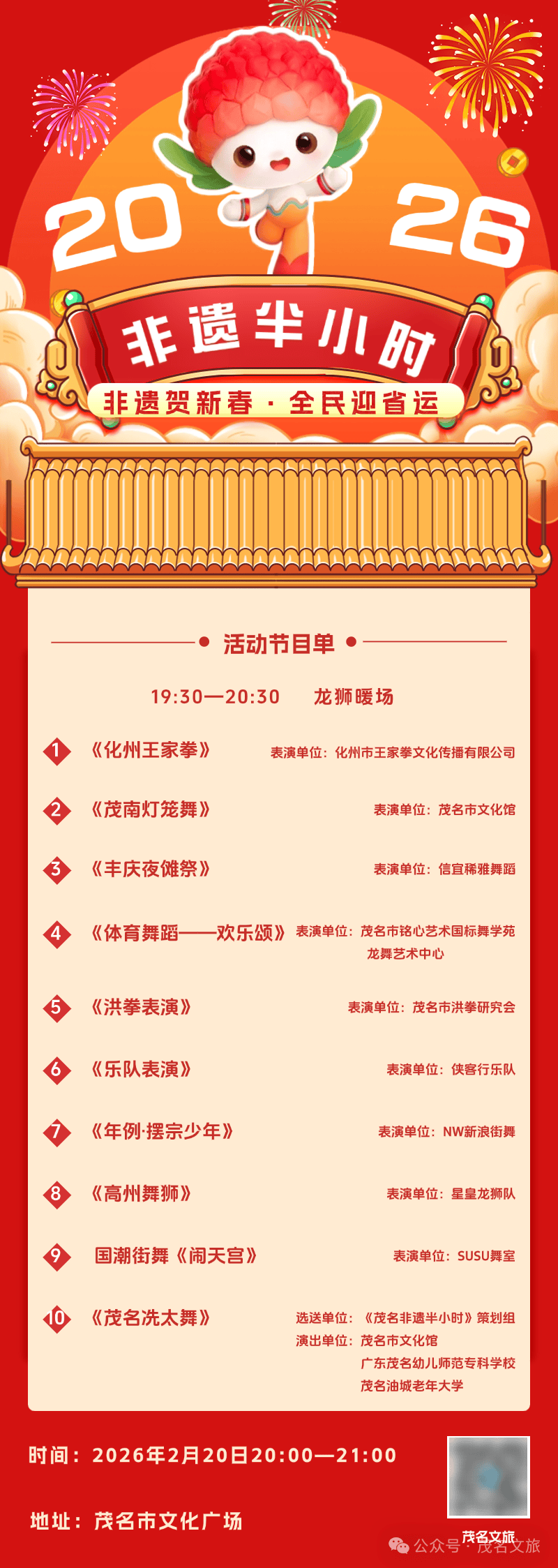 ☆2026年2月20日(正月初四),茂名市文化广场,我们备好了非遗盛宴、趣味挑战、地道好物,点起灯笼,烧热福肉,静候你赴约。