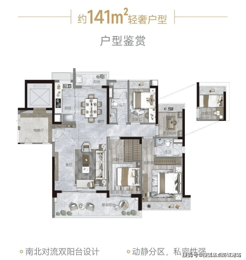 :作为项目的品质改善户型,分布于3、5栋,采用两梯三户设计,部分房源享有专梯入户,尊贵感十足。双主套布局充分兼顾家人的私密性,客厅开间达5.9米,连接8.3米超大观景阳台,直面山景与园林,气势恢宏。户型内还预留了独立家政间和储物间,有效解决了大户型的收纳痛点。全屋精装标准再次升级,配备双层中空隔音玻璃和全屋净水系统,适合注重居住品质的三代同堂家庭,总价约659万起。