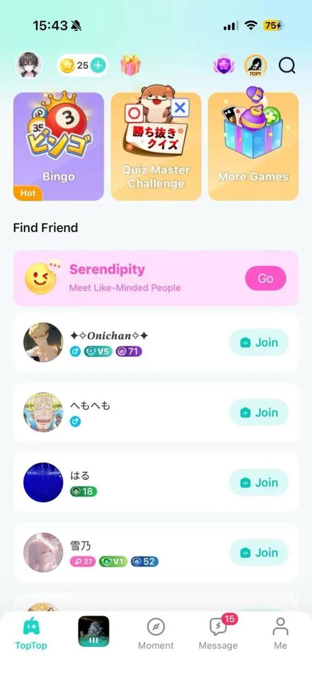 虽然所有游戏都允许玩家通过开麦或打字的方式进行交流,也可以直接在游戏内添加好友,但相比 WePlay 靠“太空狼人杀、K 歌”等强社交游戏直接让用户破冰的思路,TopTop 中的游戏选择下,用户不一定要说话,给到社交压力更小。如果用户很 E,有社交需求,产品在小游戏下方会推荐活跃的语音房,用户可以一键进入。