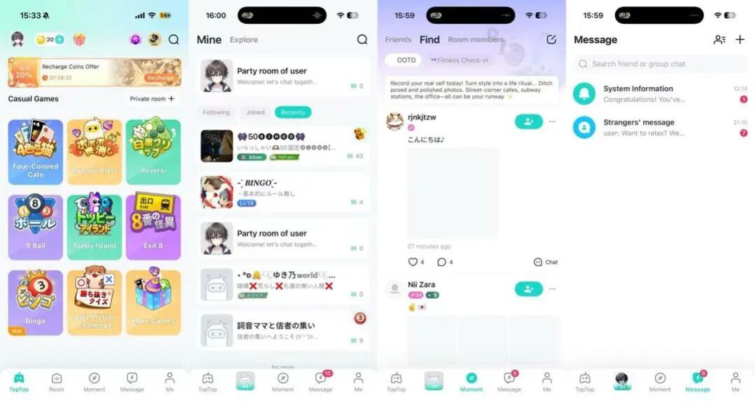 游戏版块,TopTop 日版一共有 12 款小游戏,其中既有 Four Colored Cats(换皮版 Uno)、Quiz Master Challenge(知识问答)等比较大众化的游戏,也有 Exit 8(玩法借鉴日本知名独立游戏 The Exit 8)、翻转棋等“日本国民级游戏”。相比 WePley 中玩家较多的“太空狼人杀”“K 歌”等强制需要用户开麦说话的游戏,TopTop 的小游戏更偏向于偏竞技和对抗,亦或者是概率型。