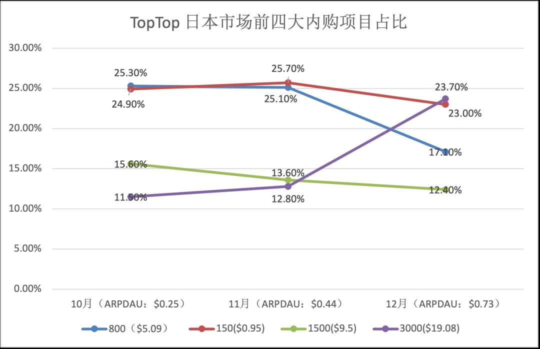 而进一步拆解商业化数据发现,从 10月份开始,TopTop 的 ARPDAU 也在快速增长,12月的平均 ARPDAU 达到 0.73 美元,已经是 10 月的接近 3 倍了,单个用户的价值显著提升。而且从付费的结构来看,10 月和 11 月,用户主要购买的是单价较低的内购项目,而到了 12 月份,单价为 3000 日元的内购项目的收入占比跃升到了 23.7%,超过了其他的内购项目,从这一点来看,产品找到了自己的“大 R”用户。