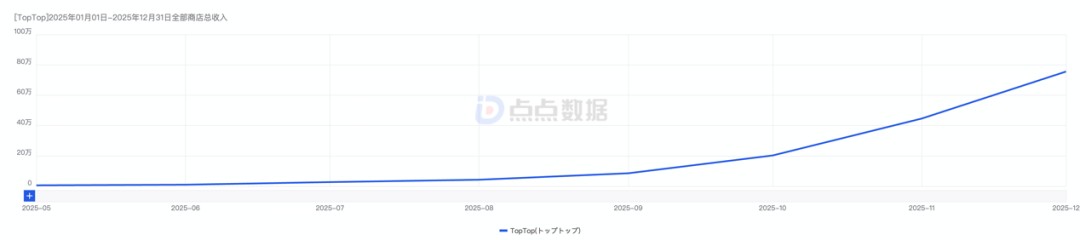 TopTop 于 2025 年 4 月 24 日上线日本,距今大半年的时间,月下载量稳定在 15 万左右,月流水也从 2025 年 10 月开始出现明显提升,12 月份,日本单一市场的流水来到了 75 万美元,约合人民币 500 万。