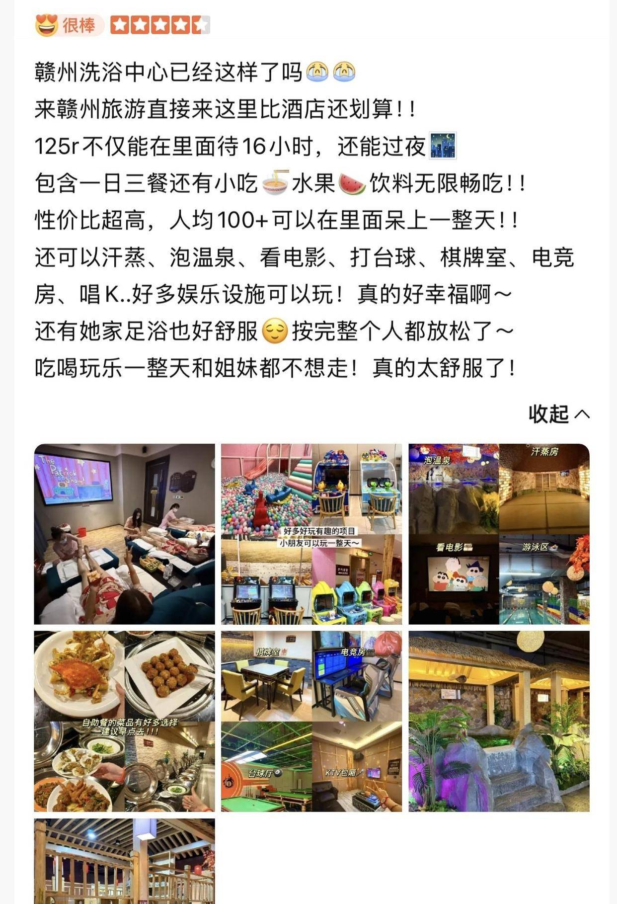 高性价比是年轻人选择洗浴中心最理性的底层逻辑。 根据大众点评价格,在赣州,含过夜的水会,基础门票人均不到200元,其他城市也都在200元左右。 这意味着什么? 在上海深圳,这个价格可能只够看场电影加杯咖啡,但在洗浴中心,你能待上一整天,包含泡澡、汗蒸、休息、娱乐。 横向对比往往更加直观,在深圳单独做一次SPA可能就要四五百元,但去洗浴中心,价格只是它的一半,却能泡一天。