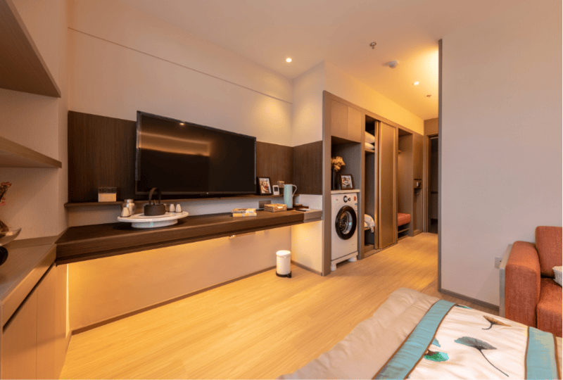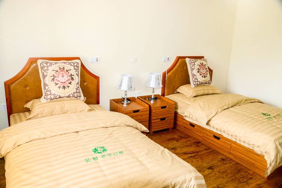 标准间50平米,套间100平米,空间宽敞不压抑,房间里电视、冰箱、空调、电话、专业养老床、衣柜、写字台全都有,而且都是适老化设计,长辈住着舒心又安全。